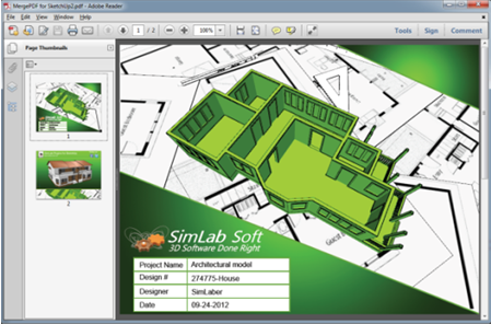 The merge feature in SimLab 3D PDF exporter for SketchUp plugin, enables users to merge different PDF files together.Users can merge comany's front pages in PDF format, with 3D PDF models' files. To learn more about the merge feature, please click here