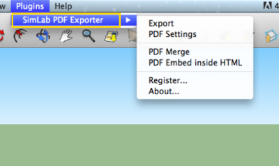 After downloading 3D PDF exporter for SketchUp plugin, a new SimLab PDF Exporter sub menu will be added under the Pluginsmenu in SketchUp, on Windows and Mac operating systems. The user can also choose to view SimLabPDF toolbar, form the Toolbars sub-menu, uner View menu in SketchUp.