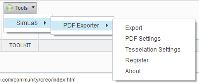 SimLab sub-menu in the Toolkit tab, under the Tools menu. PDF Exporter plugin functionalities can be accessed from this new sub-menu.
