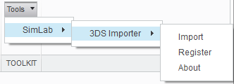 In Wildfire the plugin will add a new top level menu SimLab , to the main application toolbar, with 3DS Importer sub-menu added to it.
