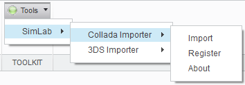 In Wildfire the plugin will add a new top level menu SimLab , to the main application toolbar, with Collada Importer sub-menu added to it.