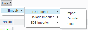 In Wildfire the plugin will add a new top level menu SimLab , to the main application toolbar, with FBX Importer sub-menu added to it.