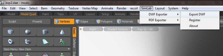 After installing the plugin, it automatically registers itself and adds a new SimLab menu to Modo. The plugin's functionalilties can be accessed from SimLab -> DWF Exporter .