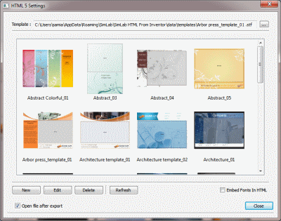 With a 3D model or assembly open in Inventor, a user can sellect/create a template for the exported HTML file. Click theSettings button in SimLab HTML Exporter ribbon, to open the HTML 5 Settings dialog, where a template can be sellected/edited/created.