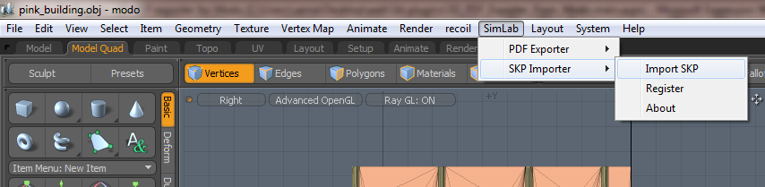 After installing the plugin, it automatically registers itself and adds a new SimLab menu to Modo. The plugin's functionaliltie s can be accessed fromSimLab -> SKP Importer.
