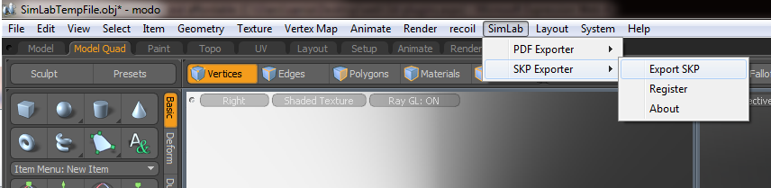 After downloading the plugin, it automatically registers itself and adds a new SimLab menu to Modo. The plugin's functionaliltie s can be accessed from SimLab -> SKP Exporter.