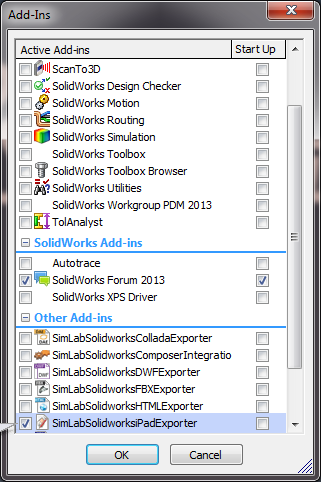 To enable the plugin's functionalities each time SolidWroks starts the Start Up checkbox should be checked as well.