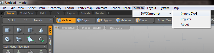 After downloading the plugin, it automatically registers itself and adds a new SimLab menu to Modo. The plugin's functionalilties can be accessed from SimLab -> DWG Importer .