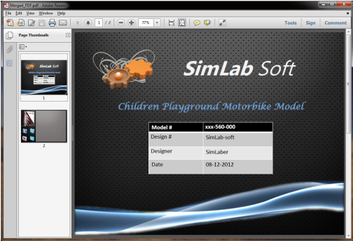 SimLab 3D PDF exporter for Alibre includes a new tool for merging multiple PDF files. Users can use the merge feature to merge a company’s front page –in PDF format– with a 3D PDF model.